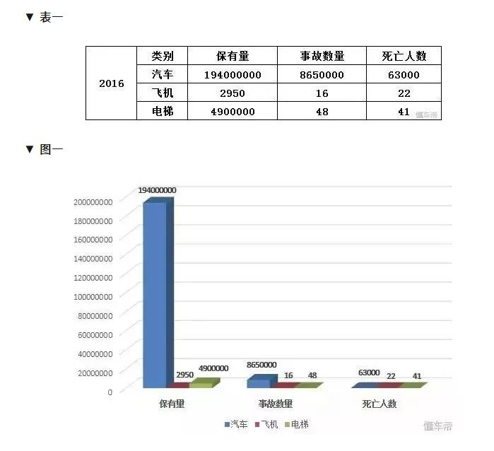 來看一組數據,表一、表二、圖一、圖二是汽車、飛機、電梯三種交通工具的保有量、事故發生率、死亡率數據對比(僅以2016年為例)。 |